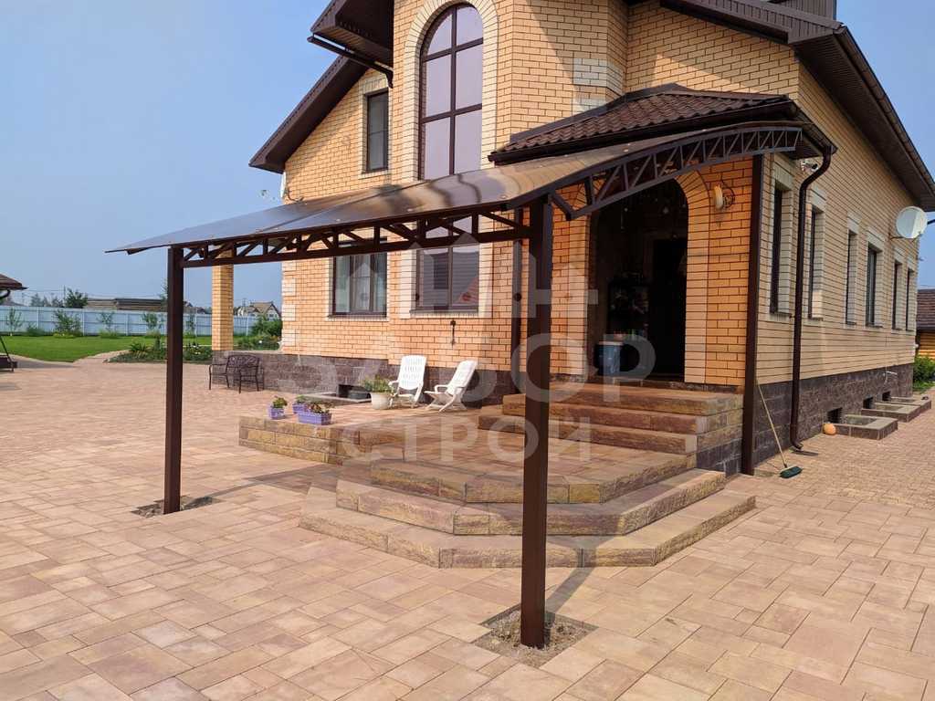 Поэтому компания "Навес Строй" настоятельно рекомендует не экономить, а усилить каркас навеса над крыльцом более жёсткими профилями с увеличенной толщиной металла и количеством несущих ферм.